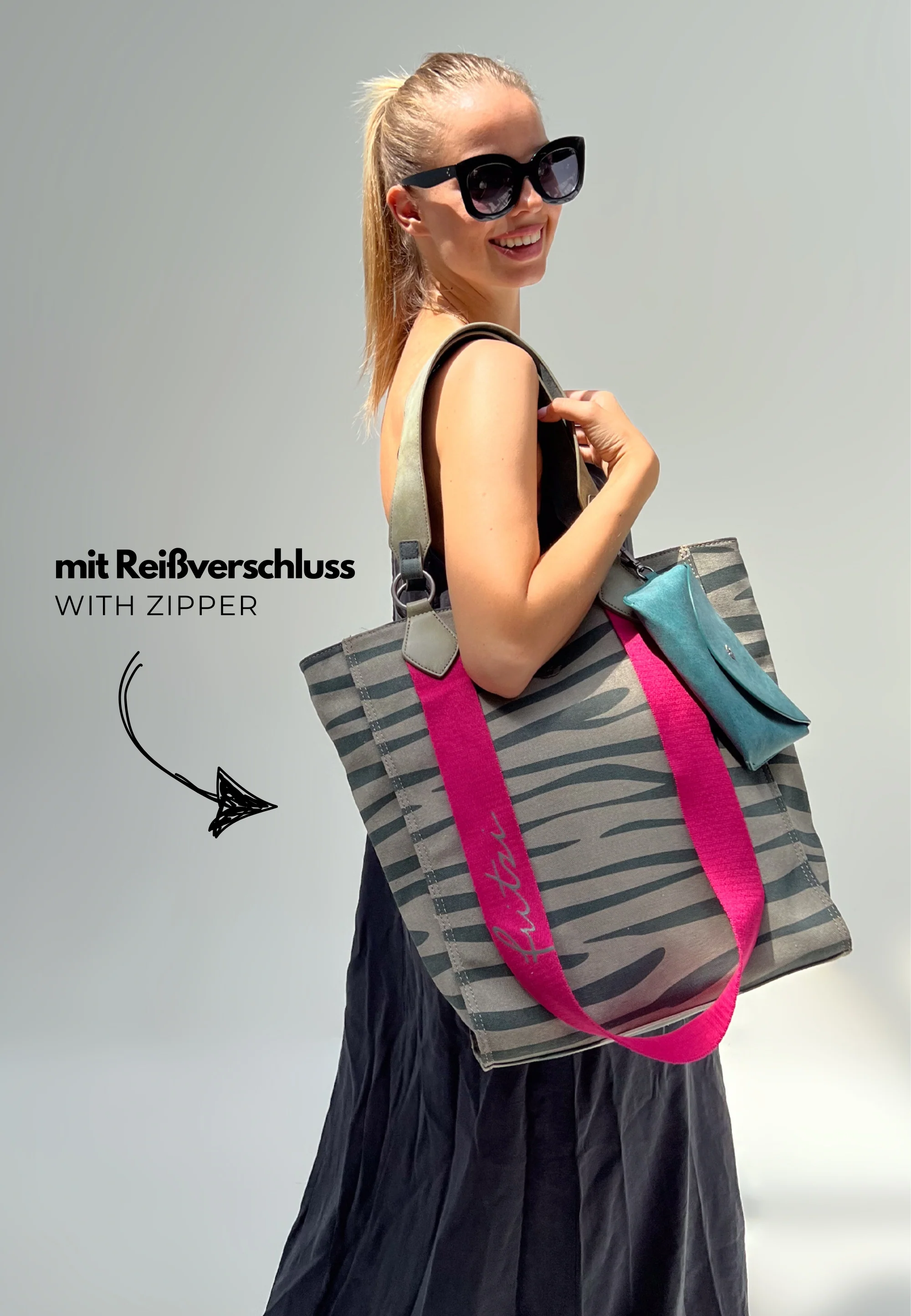 Der grafische Zebra-Print verleiht dem Style eine klare, moderne Note. Was kommt bei dir in die Extra-Tasche?